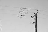 Overhead electrical line telephone cables wires danger electricity kills blue sky background electric power transmission distribution