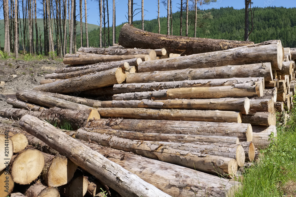 Chopped wood logs stacked in forest woodlands renewable green biomass energy summer sun Loch Lomond blue sky