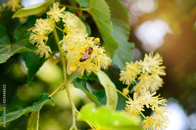 Honey bee on the blossoming linden flowers at sunny day in garden. Plant decay with insects.