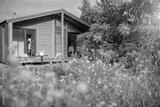 Wooden country house backyard with table and chairs outdoors during the sunset