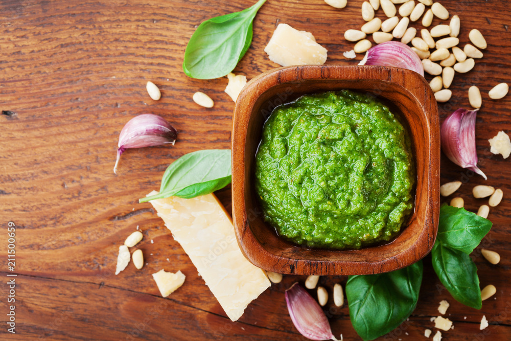 Top view pesto sauce with basil, pine nuts, parmesan cheese, garlic and olive oil on wooden table.