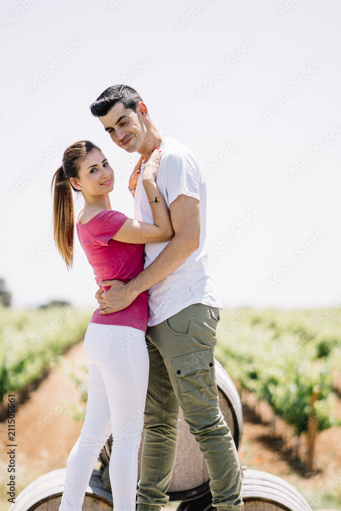 Woman and man couple posing in winery cellar.