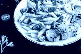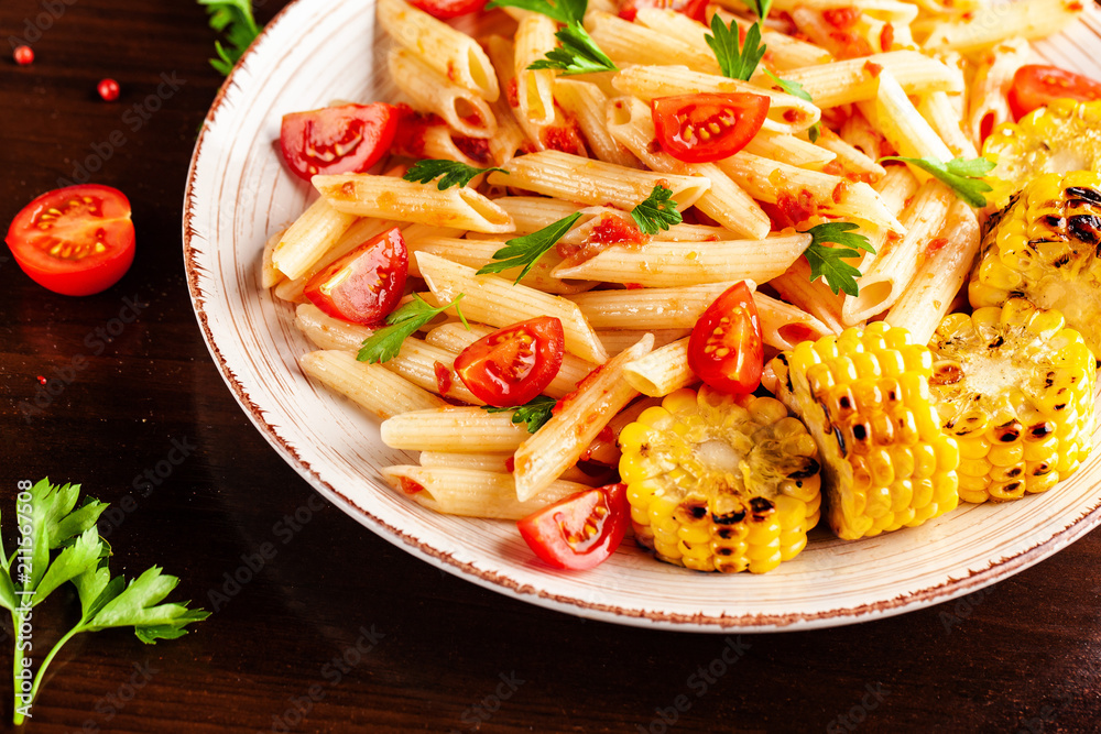Italian traditional cuisine. Penne pasta with tomato sauce and tomatoes, with parsley and grilled corn. Background image on a wooden table. copy space, top view