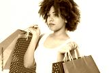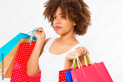 Woman shopping. Happy young african american girl with shopping bags isolated on white background. Copy space. Mock up. Summer fashion
