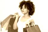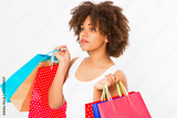 Woman shopping. Happy young african american girl with shopping bags isolated on white background. Copy space. Mock up. Summer