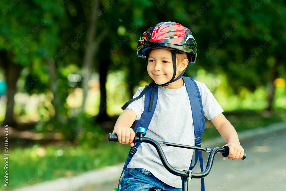 Little boy learns to ride a bike in the park near the home. Portrait of a cute kid on bicycle. Happy smiling child in helmet riding a cycling.