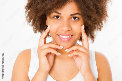 Beautiful young african american woman isolated on white background. Copy space. Mock up. Skin care, spa and make up concept. Summer time. Afro girl curly hair