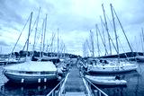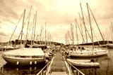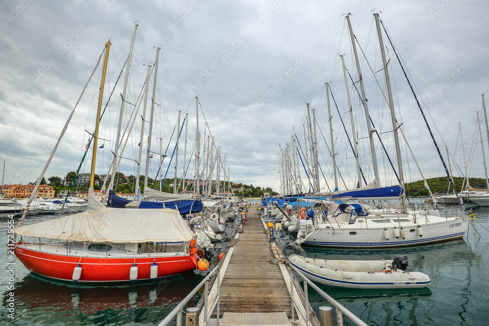 Vrsar, Croatia - May 22, 2018: Harbor with yachts of Coastal town Vrsar, Croatia. Vrsar - beautiful antique city, yachts and Adriatic Sea.