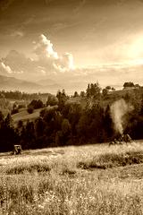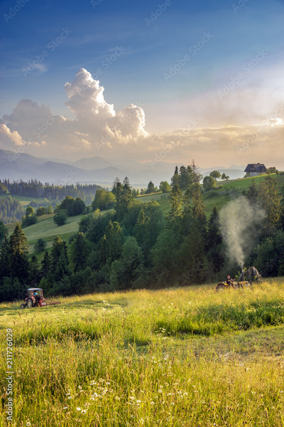 haymaking in the mountains, tractors with mowers cutting the meadows in the Polish mountains