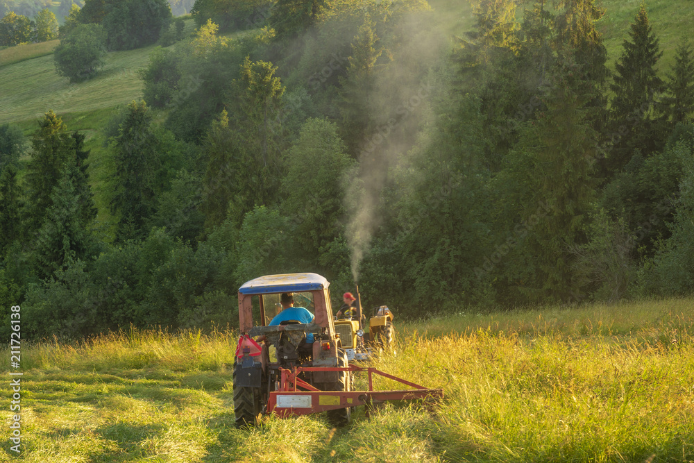 haymaking in the mountains, tractors with mowers cutting the meadows in the Polish mountains