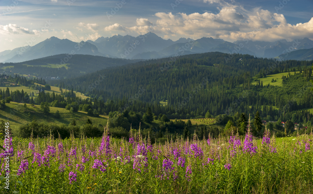 Panorama of the Tatra Mountains in Poland, flowers blooming on a mountain meadow