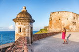 Old San Juan city tourist taking photo in Puerto Rico. Woman using phone taking pictures of ruins of watch tower of San Cristobal Castillo Fort, with ocean background.