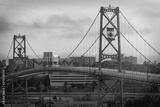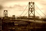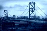 The Angus L MacDonald Bridge at dusk on Canada Day with large Canadian flags flying.