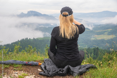 Blond Woman photographing with smartphone a view from the top of a mountain to a misty mountain valley
