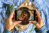 Woman hands take smartphone food photo of cherry cold chrianteli soup. Phone food photography for social media or blogging in popular and trendy top view style. Raw vegan vegetarian meal concept.