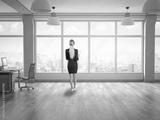 A business woman holding documents in hands. Open space loft office. Panoramic windows background.