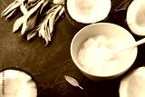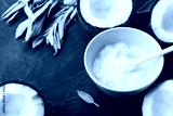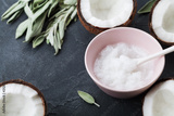 Coconut oil with fresh coconuts fruit on black stone background. Natural and organic beauty cosmetic.