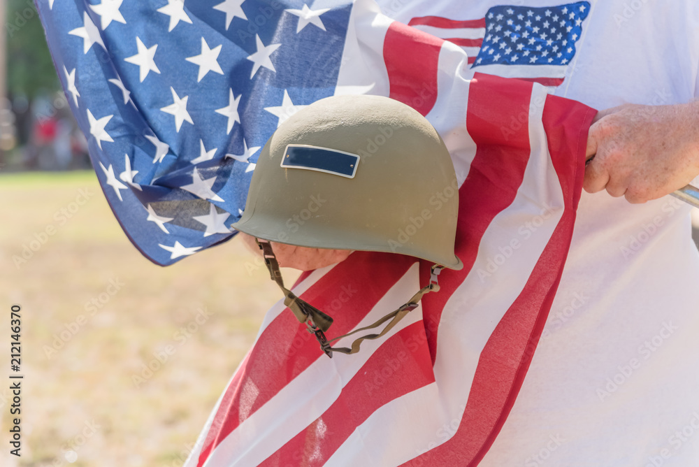 American veteran proudly holding military WWI helmet (M1 helmet) and US flag during parade. July 4th or veteran memorial day poster of WWII, modern wars. Honor and remember soldier troop background