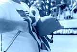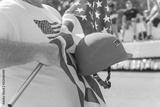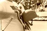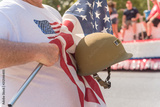 Side view a white veteran proudly holding military WWI helmet (M1 helmet) and US flag. July 4th or veterans day poster of WWII, modern wars. American soldier troop during parade with people watching