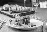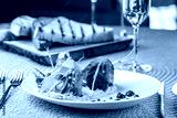 The concept of high European cuisine, molecular cuisine. Dish in an expensive restaurant of vegetables from the garden. expensive table server, on the table instruments and a glass of champagne.