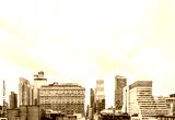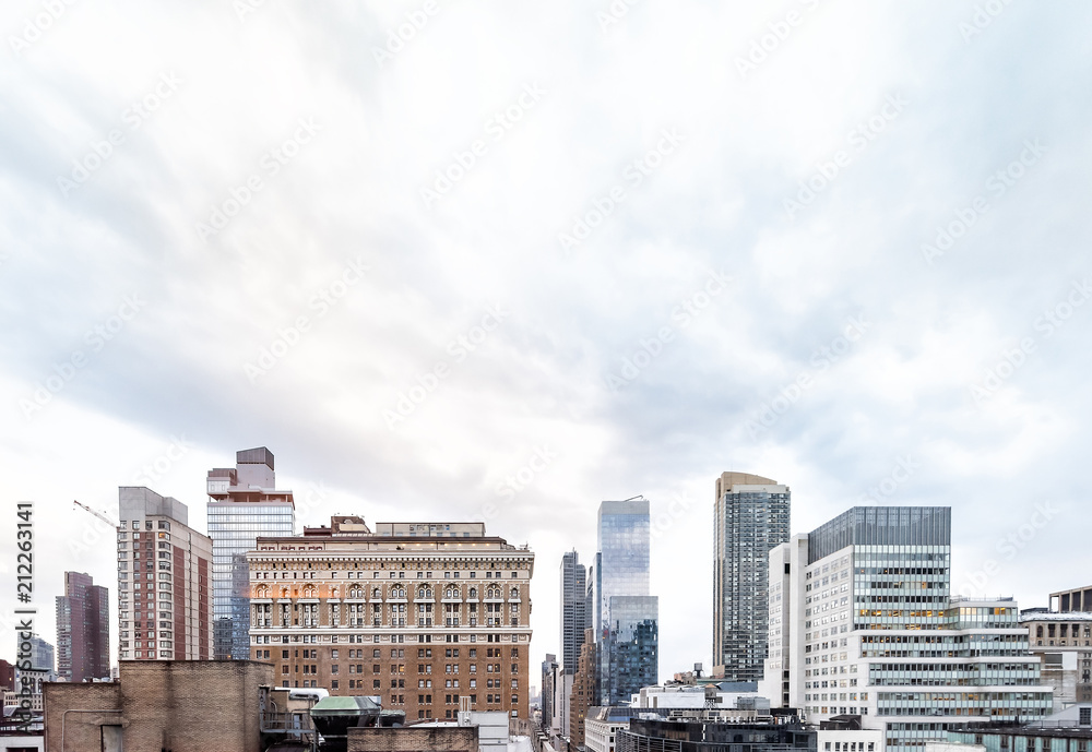 New York City aerial view of urban cityscape, skyline, rooftop building skyscrapers in NYC Herald Square Midtown with cloudy overcast sky