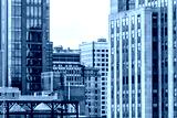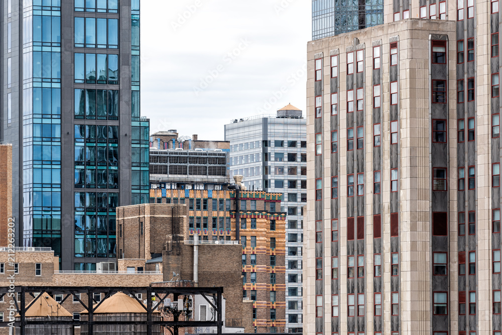 Closeup pattern of modern skyscraper buildings architecture, sky in New York City NYC aerial view through window, many windows