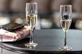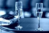 Macro closeup of two glasses of white sparkling champagne wine in restaurant or wedding reception black table bokeh background, nobody, woman's purse handbag and phone
