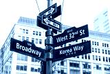 Manhattan NYC buildings of midtown near Korean Town, Korea Way road signs on west 32nd street, Broadway in New York City