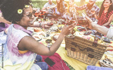 Happy millennials friends drinking and eating at picninc dinner outdoor