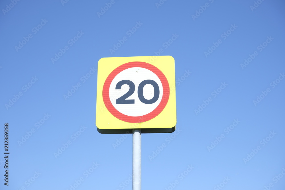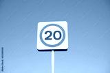 Twenty 20 mph road highway traffic safety sign against blue sky background