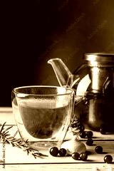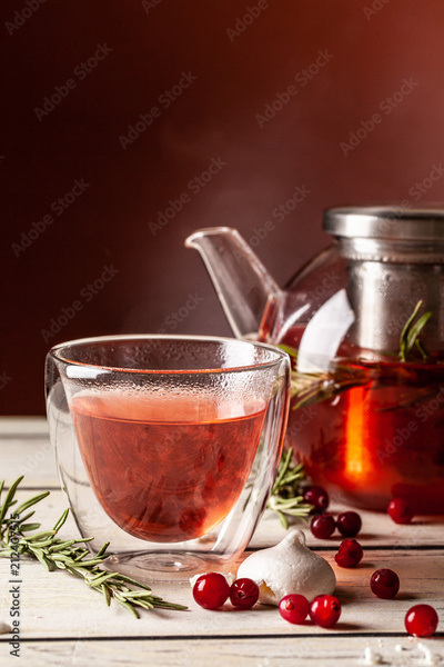 Mint tea with forest berries in a cup of double glass and a glass teapot on a wooden table, on a red background.