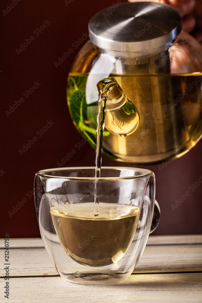 Mint tea with forest berries in a cup of double glass and a glass teapot on a wooden table, on a red background.