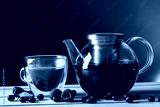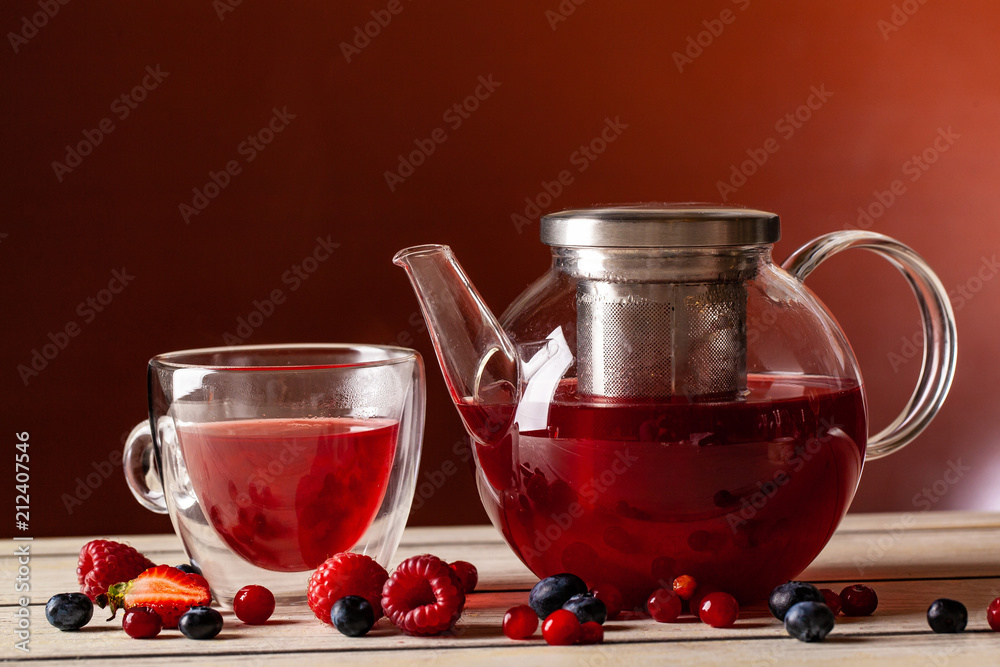 Mint tea with forest berries in a cup of double glass and a glass teapot on a wooden table, on a red background.