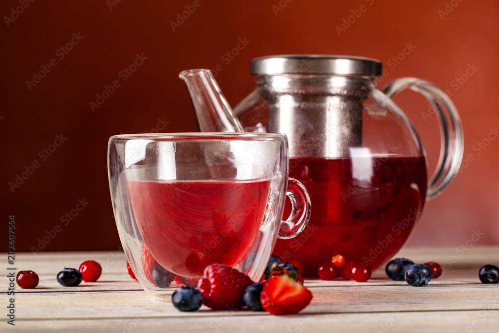 Mint tea with forest berries in a cup of double glass and a glass teapot on a wooden table, on a red background.