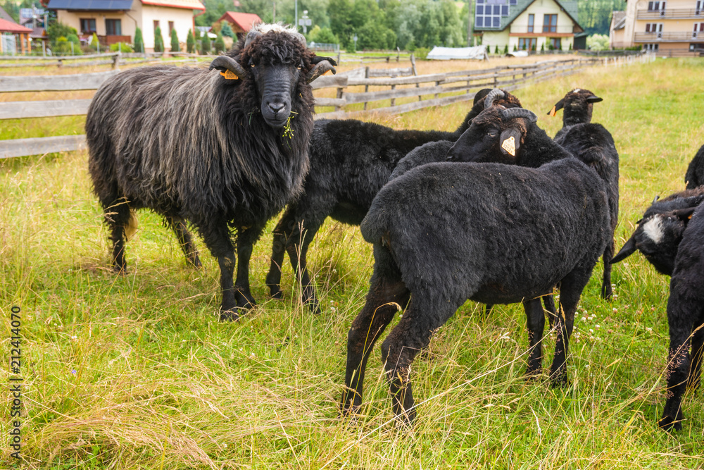 flock of black sheep in the pasture