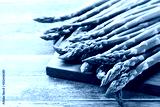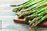 Harvest of young green asparagus sprouts on rural wooden table. Organic vegetarian food.