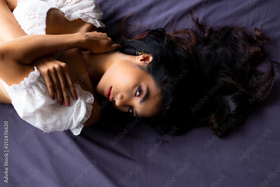 Portrait loneliness beautiful woman. Charming beautiful woman is lying down on a bed and looking at camera. Gorgeous woman feels lonely. Glamour girl live alone in the house. Asian girl looks so sexy