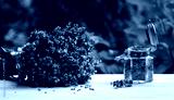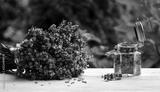 Bouquet of fresh lavender and dry lavender in a glass jar on a white table on the garden background.