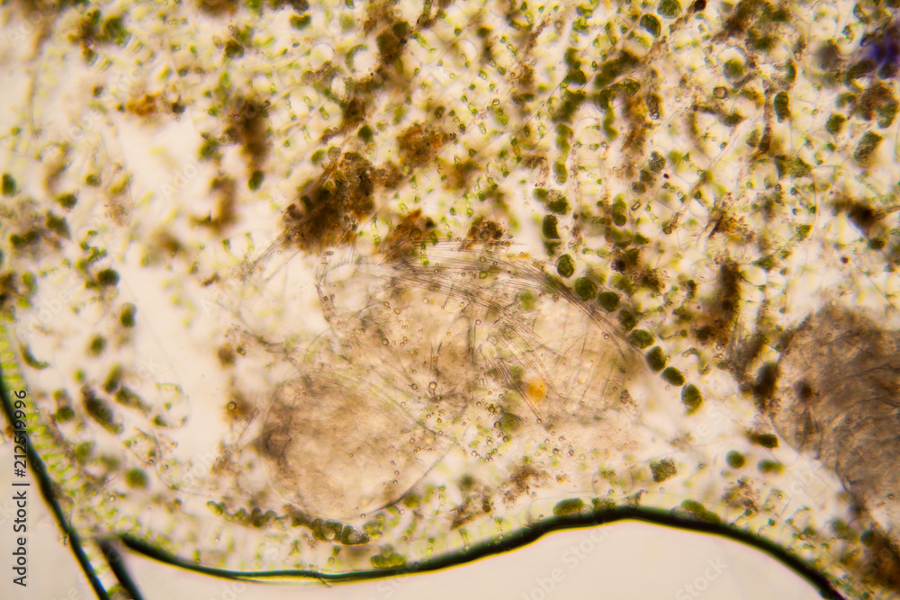 Fresh pond water plankton and algae at the microscope. Dead copepod details