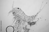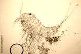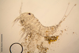 Fresh pond water plankton and algae at the microscope. Dead copepod