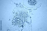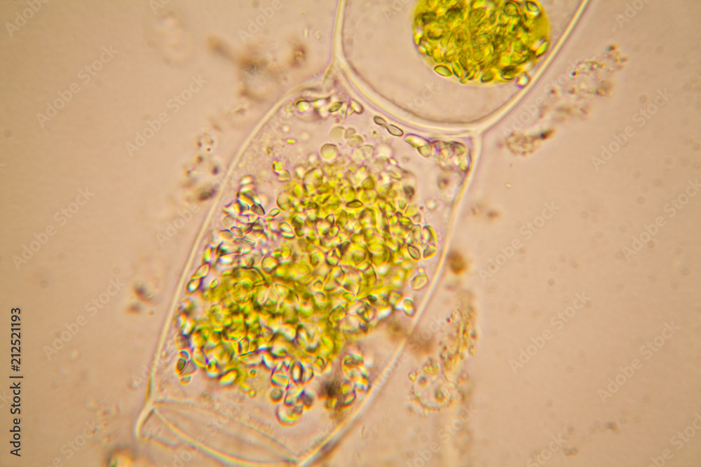 Fresh pond water plankton and algae at the microscope. Spirogyra