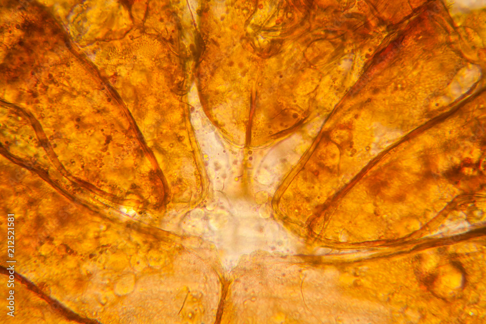 Fresh pond water plankton and algae at the microscope. Pond mite body parts