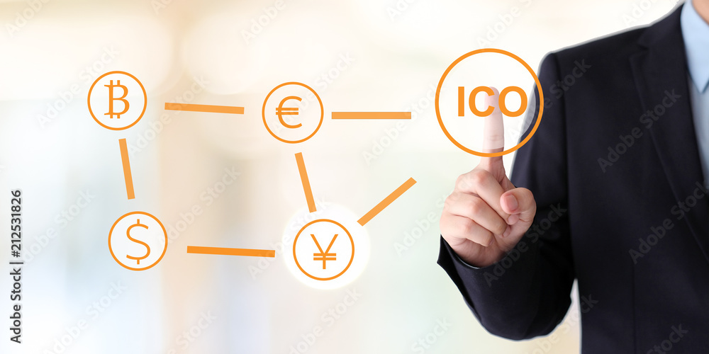 Businessman hand using smartphone with ICO, Initial Coin Offering, icon on a virtual screen. Cryptocurrency, Bitcoin and ICO Digital Electronic Trade Market Stock Index concept.