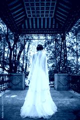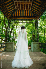 A beautiful bride stands with her back in her wedding dress. Dress with lace.