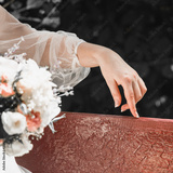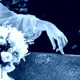 close-up of the bride's fingers playfully play the groom. The bride and groom are sitting on a bench.