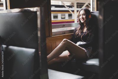 Attractive beautiful woman is going back home by using a retro train. when pretty girl is thinking about her family that makes her happy and smile. Lovely woman sits on train and listening nice music
