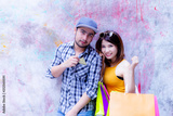 Handsome boyfriend is taking girlfriend to shopping mall. Handsome guy use credit card for buying favorite goods. Beautiful girlfriend gets happiness and holding shopping bags. She buys a lot of goods