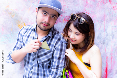 Attractive beautiful woman or girlfriend is begging or asking boyfriend for shopping or buying goods, brand name product and her handsome boyfriend is spoiling her by giving his credit card to her.