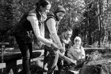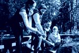camping, travel, tourism, hike and people concept - happy family roasting marshmallow over campfire