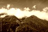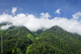 Mountain peaks covered with green forest against the blue summer sky with white clouds. Landscape of georgian nature